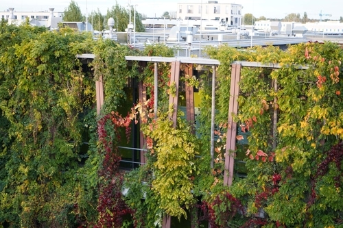 Die Fassadenbegrünung steht im unmittelbaren Zusammenhang mit der energetischen Optimierung des Gebäudes. Im Sommer soll die Fassade begrünt sein und einen aktiven Sonnenschutz bieten, während das Sonnenlicht im Winter die Glasfassade ungehindert passieren kann. Ein zweiter Effekt ist die Erzeugung von Verdunstungskälte zur Verbesserung des Mikroklimas innerhalb des Gebäudes und im unmittelbaren Gebäudeumfeld